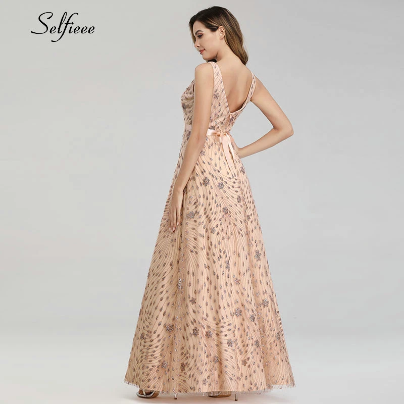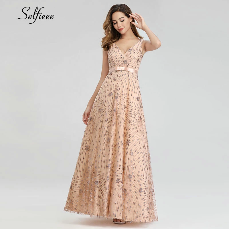 BEST QUALITY Sparkle Rose Gold Summer Dresses A-Line V-Neck Sleeveless Bow Sashes Sexy Maxi Dresses Woman Party